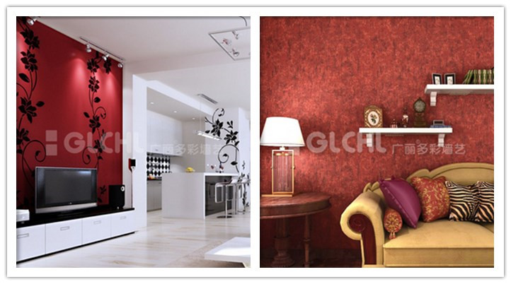 一、红色是最抢眼的颜色,与在视觉上起收缩效果的蓝色相比,红色对视觉起强烈的冲击作用。所以使用上,一定要注意缓和压迫感,在使用量上要控制在总量的2成左右,或者不用鲜亮的红色,而改用灰色调或暗色调的红色,广丽建议尽量将有强烈视觉冲击的颜色用在局部装饰中,例如背景墙的装饰,可使用广丽森特壁材系列艺术涂料与这类颜色进行搭配,即体现质感,又能让房间墙面产生亮点。